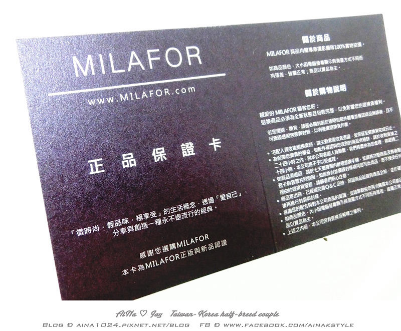 購買『 MILAFOR 』商品時 一定要檢查有沒有收到正品保證卡 以確保保證喔!