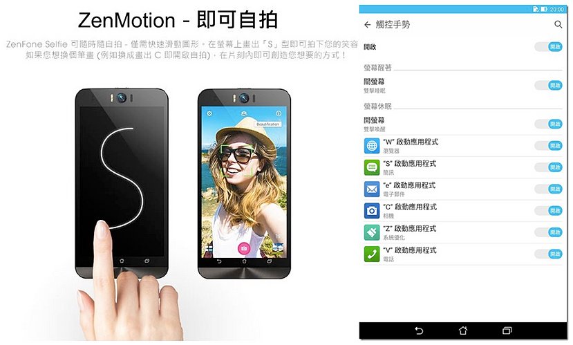 - 前鏡頭: 手勢畫S,即可開啟前鏡頭自拍